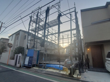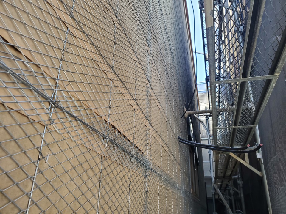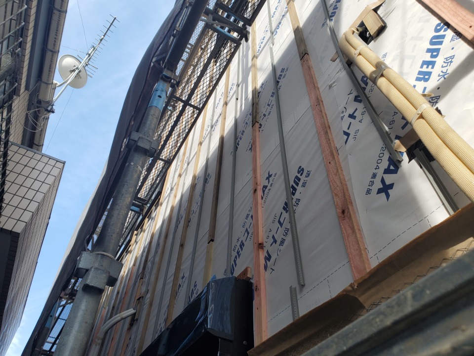 外壁 左官工事の下地で、通気胴縁の施工が入りました。