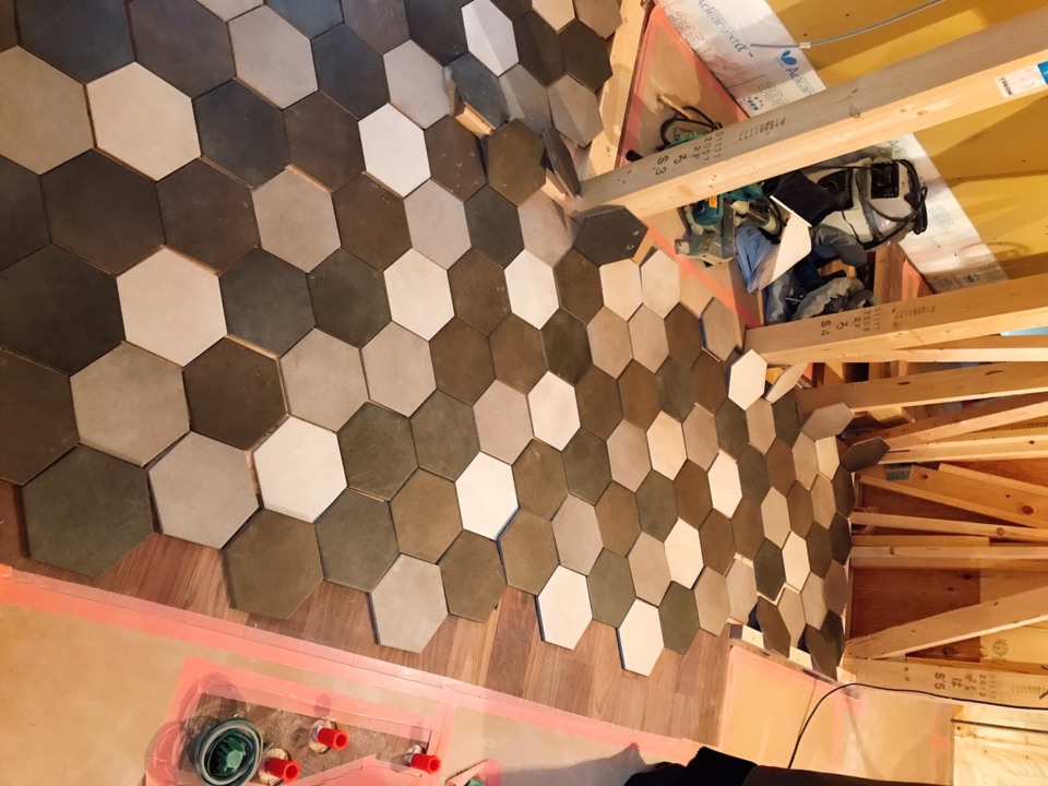 本日、室内のヘキサゴンタイルの配置をお客様と一緒に並べながら決めました。