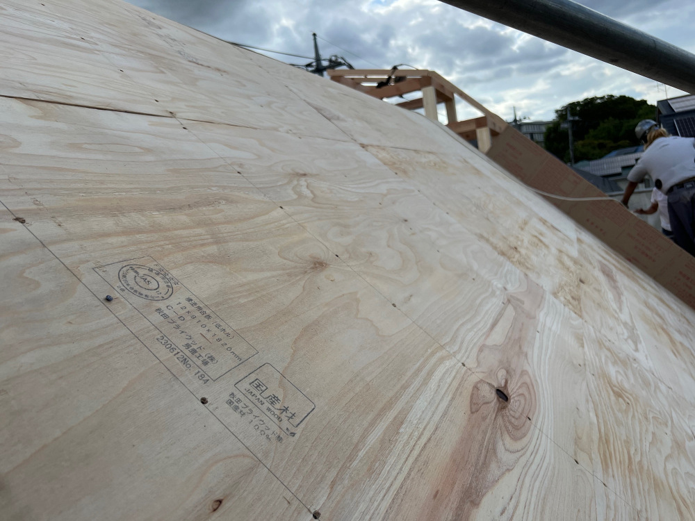 屋根材の下地になる野地板の施工を行いました。