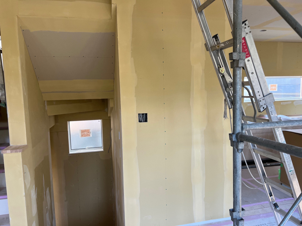 クロスを張る前処理としてボードの継ぎ目やビスのところへパテ処理をし平にする作業を行っています。