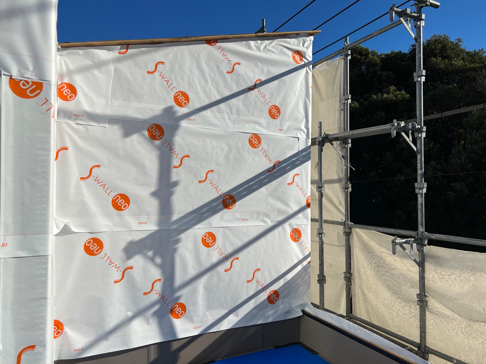 壁下地に透湿防水シートを施工しました。