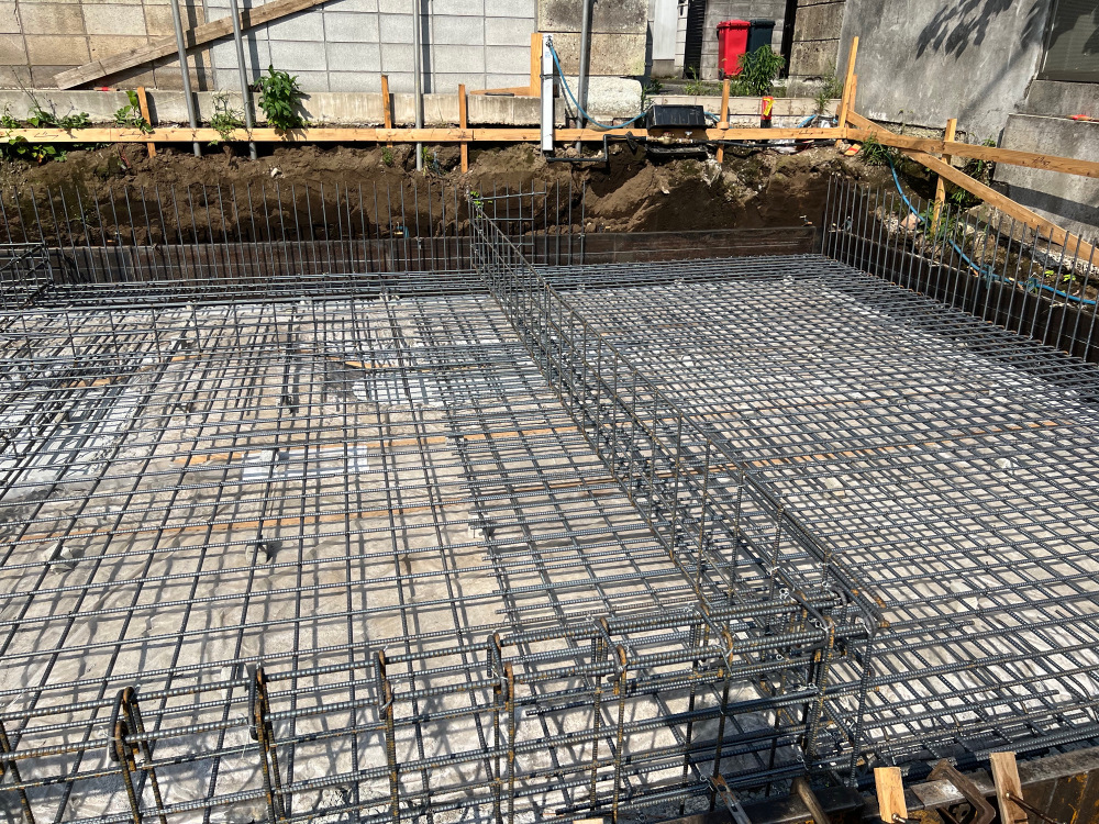 基礎の図面通りに鉄筋を配列させることを配筋といい、全て完了した時点で、自社チェック・第三者機関による配筋検査を受けます。