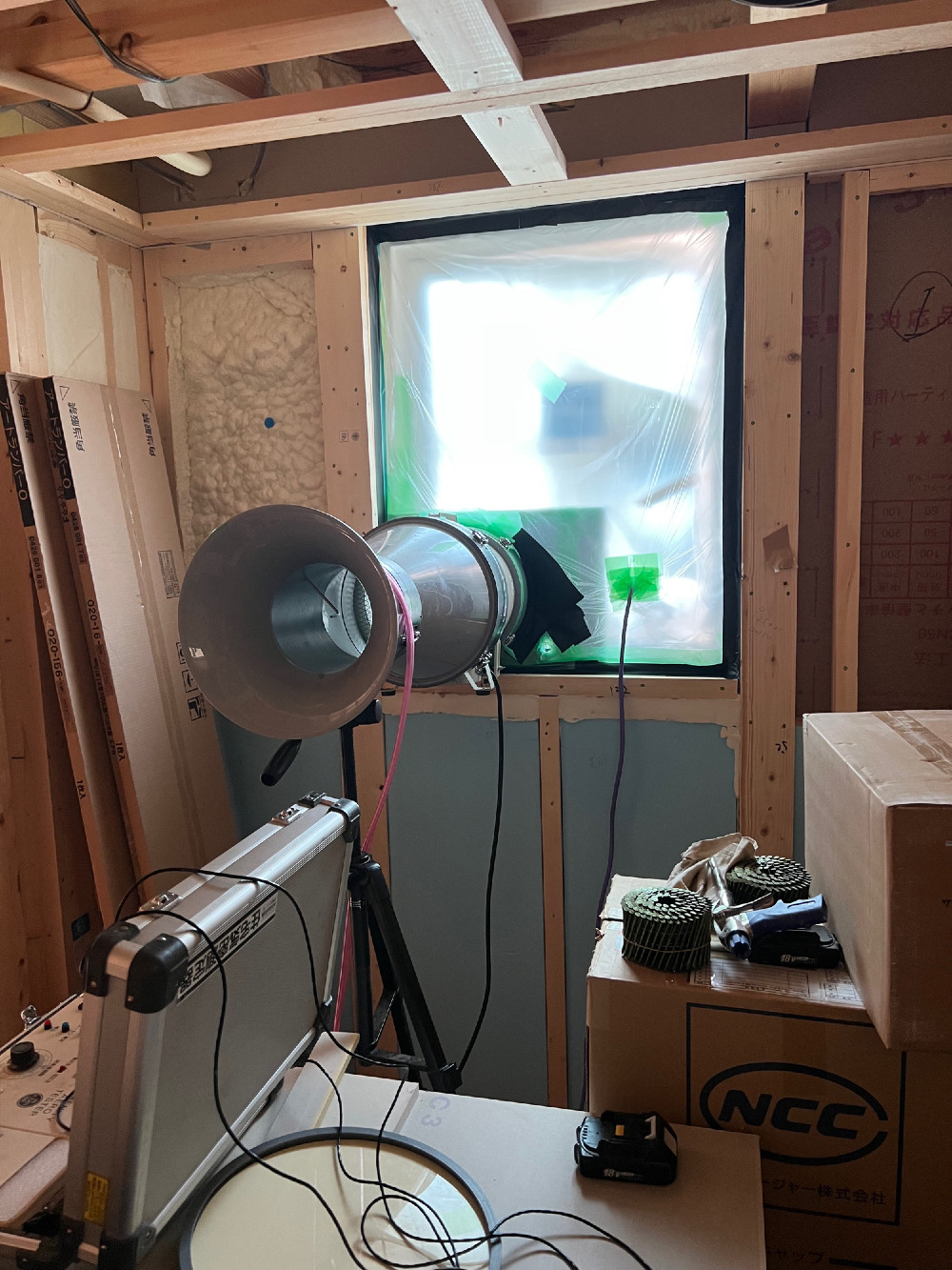 こちらの測定機器を使い、家中の相当隙間面積を測ります。社内基準をクリアしましたので次の工程に進みます。