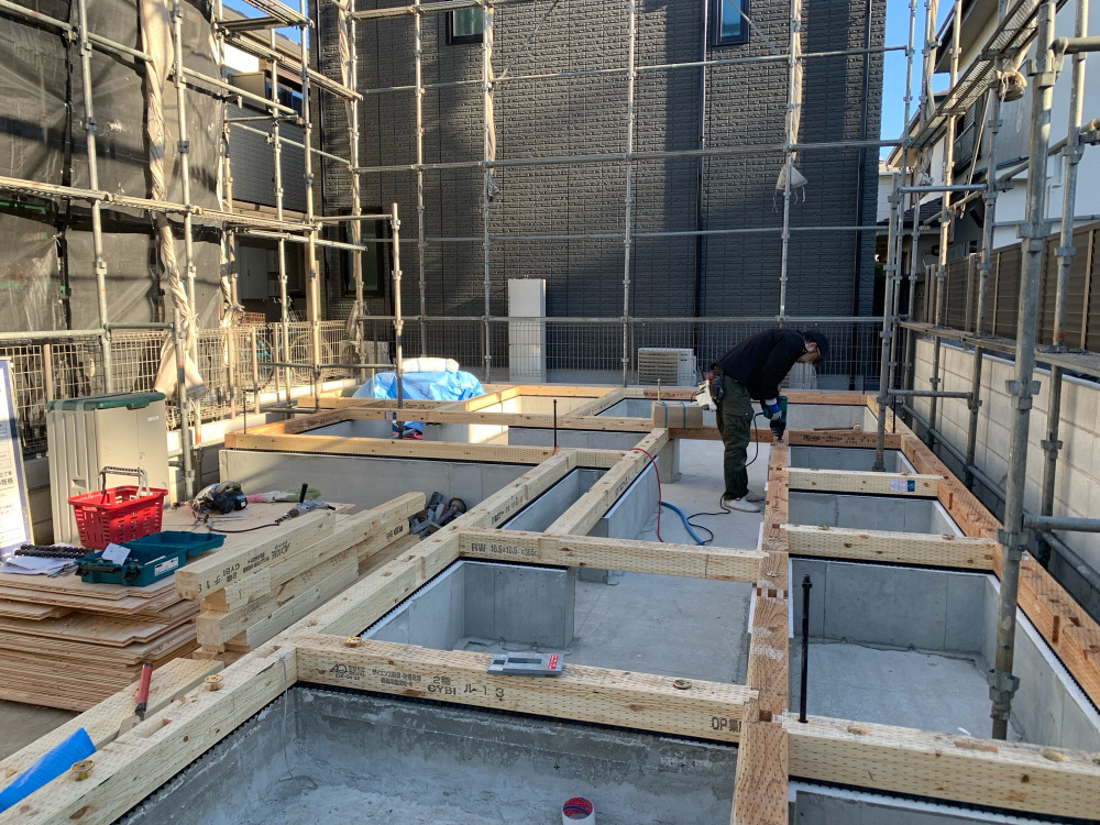 基礎工事が完了し木工事の最初となる土台敷きを行いました。