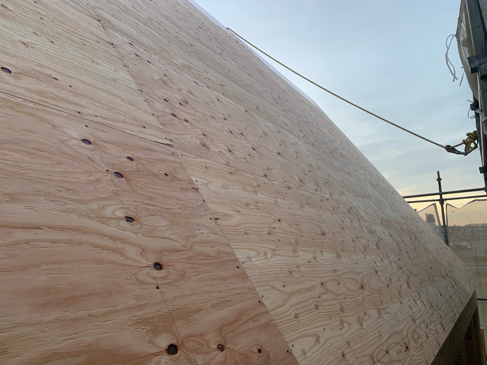 屋根の構造は、下から一般的に野地板→ルーフィング→メイン屋根材の順に仕上がります。