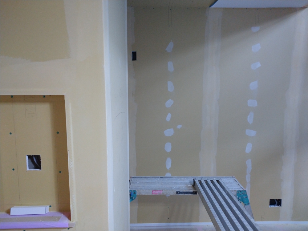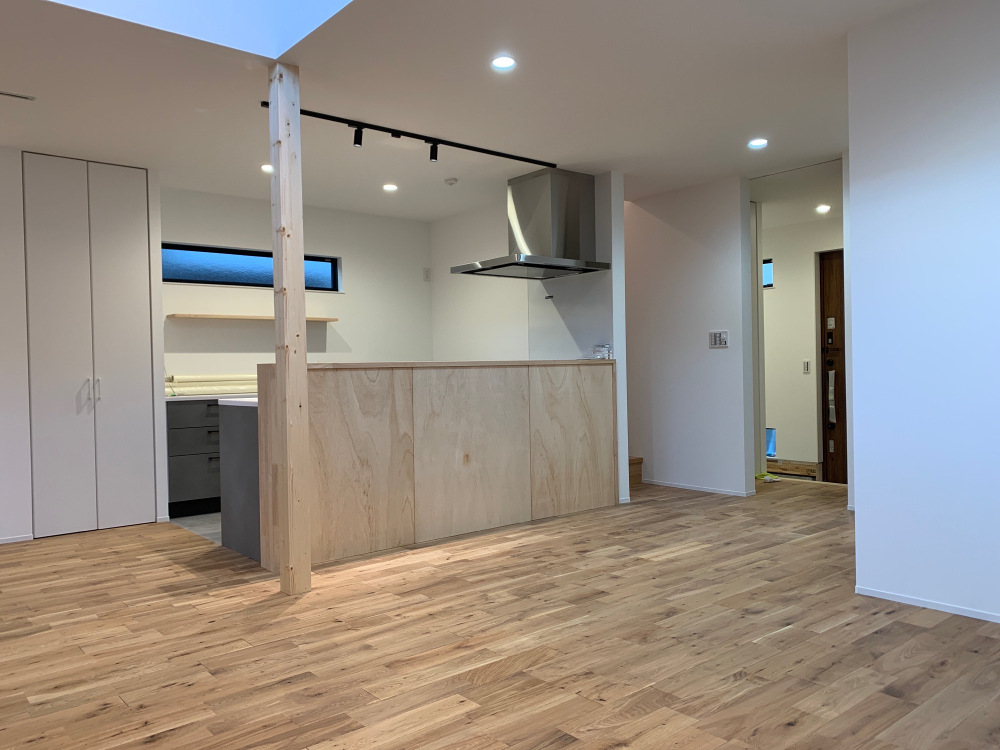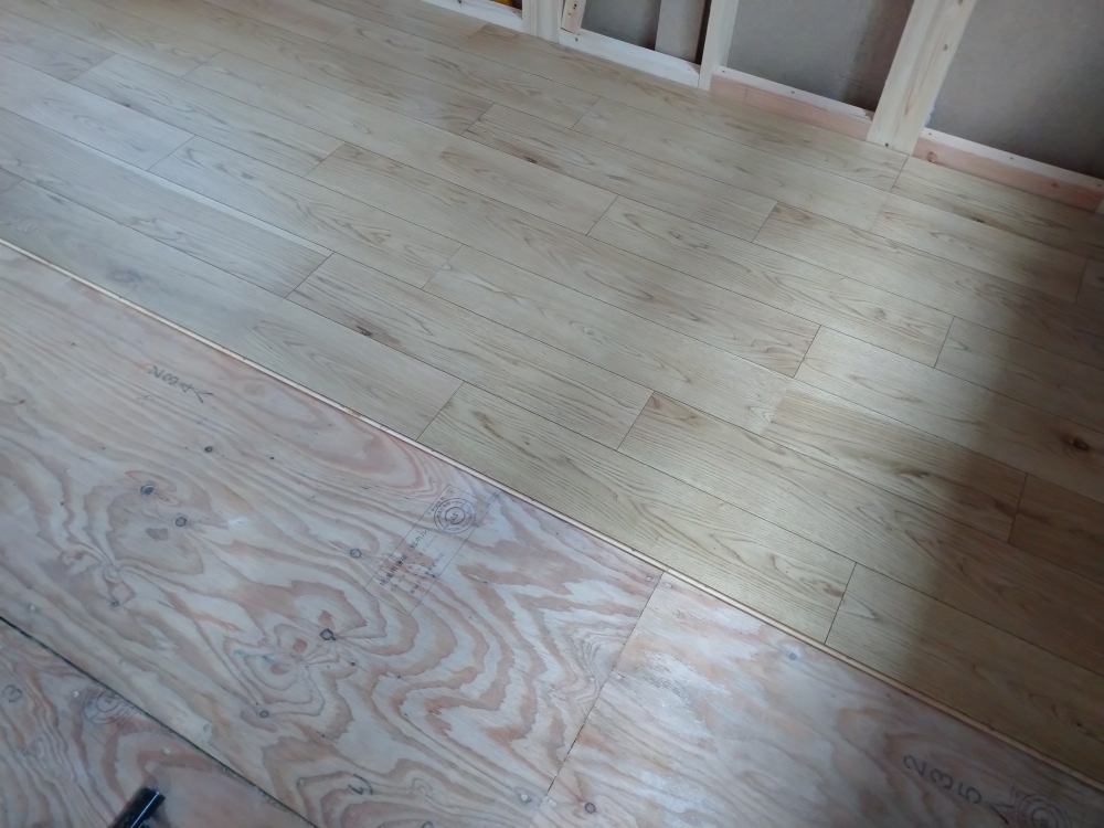 フローリングの施工中です。敷き詰めてからは養生をしてしまうため完成時にお披露目となります。