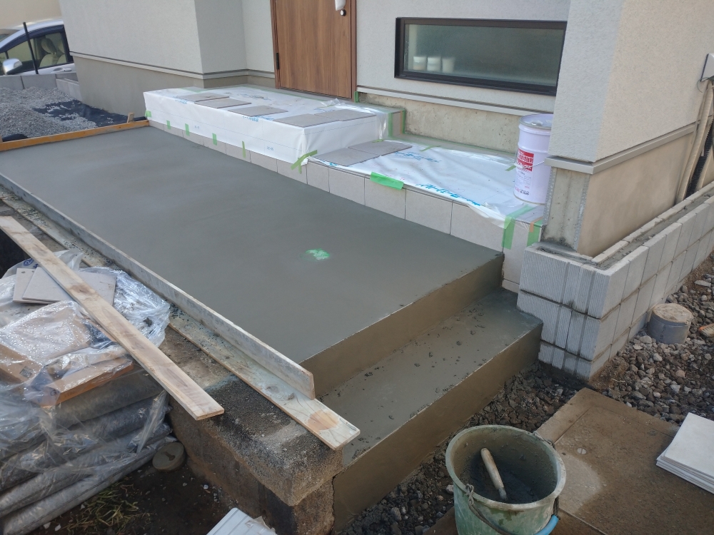 外構工事中です。玄関ポーチの階段の左官を行っています。