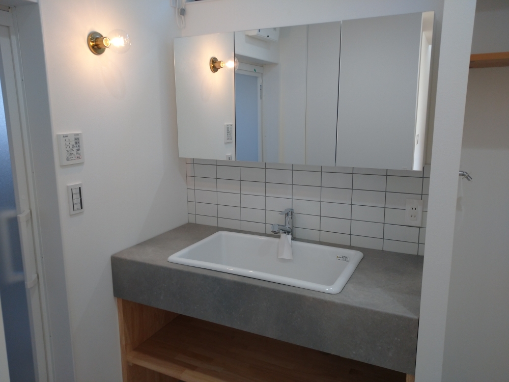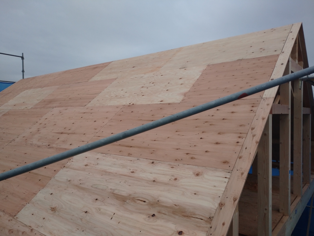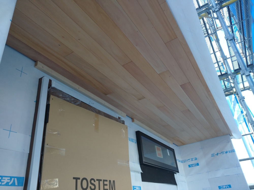 玄関軒の施工が完了しました。木製の羽目板を使用しています。