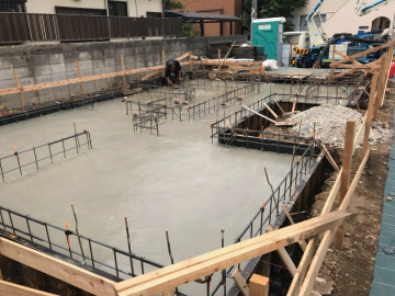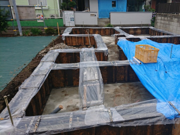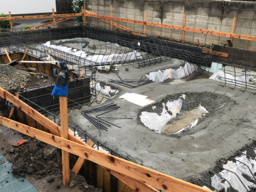 今後は、耐圧盤が乾いたらその上に立上り部分の枠を固定し、次の生コンの打設の準備をいたします。