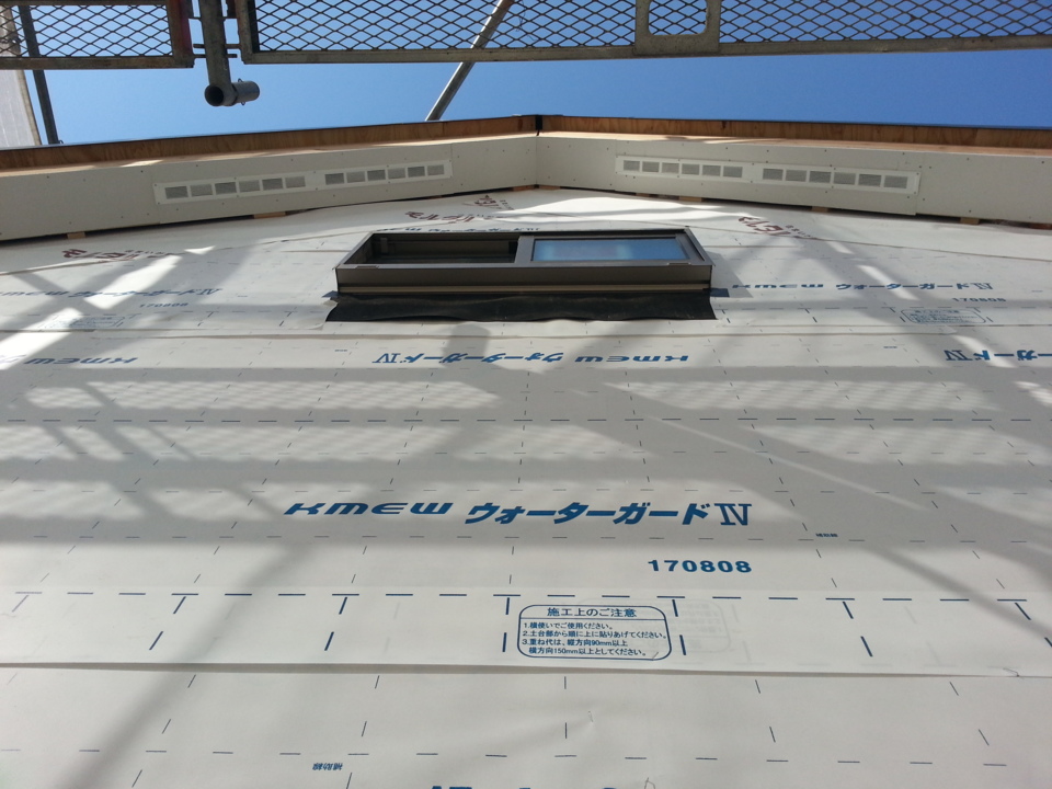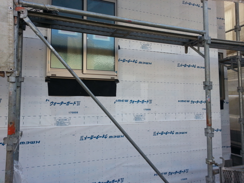 外壁下地(構造用合板:ダイライト)を施工後、外壁業者が透湿防水シートを施工します。