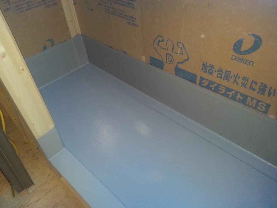バルコニーに接するアルミサッシ(窓)部分が一番心配される雨水漏水部分なので、そこをしっかりと巻き返して防水処理をし、サッシ取付後にコーキングにて再防止策をこうじます。