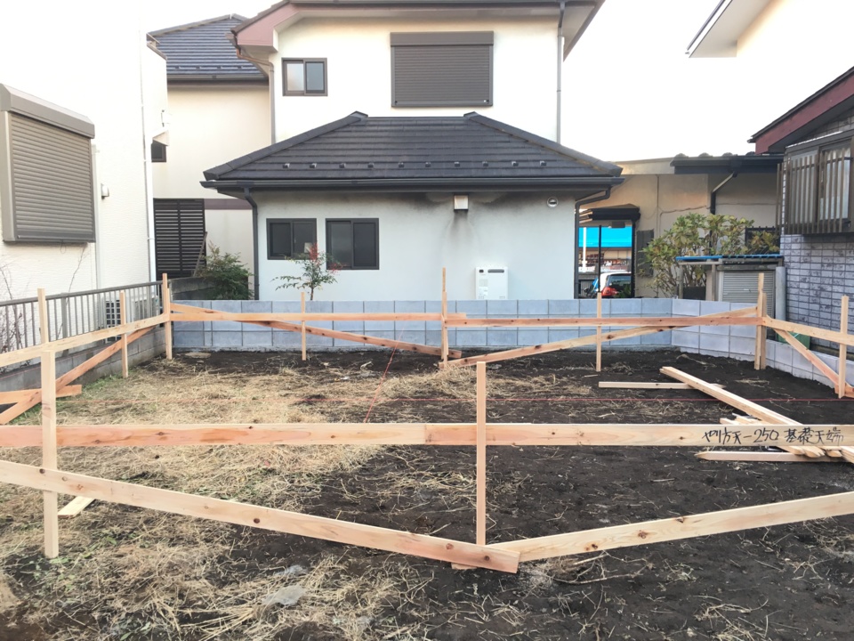 立ち入り禁止の柵の様に見えますが、これも【遣り方】という大事な建築工事の一つです。