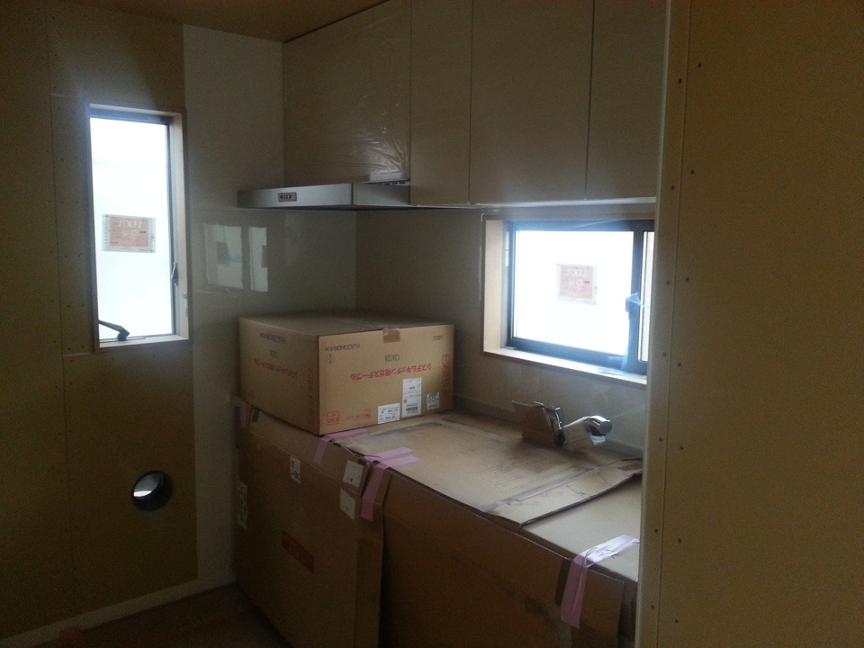 取付キッチンの幅よりも、現場のキッチン設置スペースのほうが若干広かったので、大工さんに壁をフカしてもらいました。