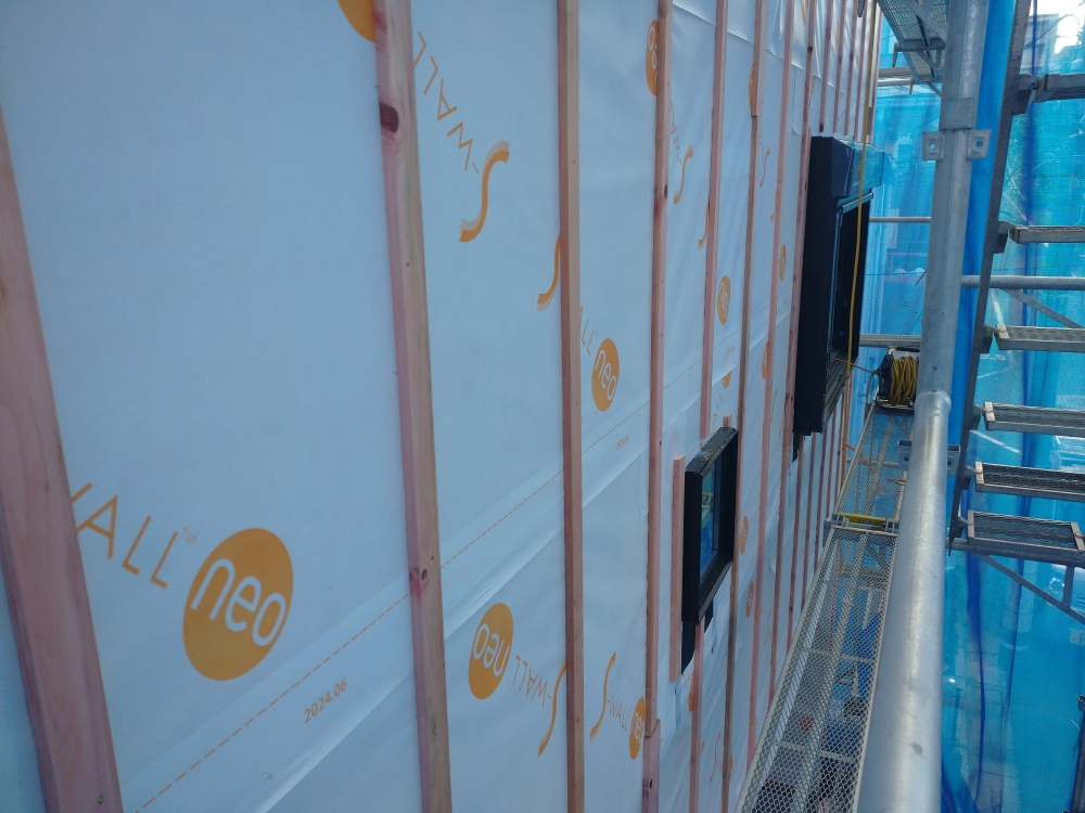 外装下地検査とは、防水シートの重ね代・外壁貫通部の防水処理・サッシまわりの防水テープの施工状況のチェックを受けます。