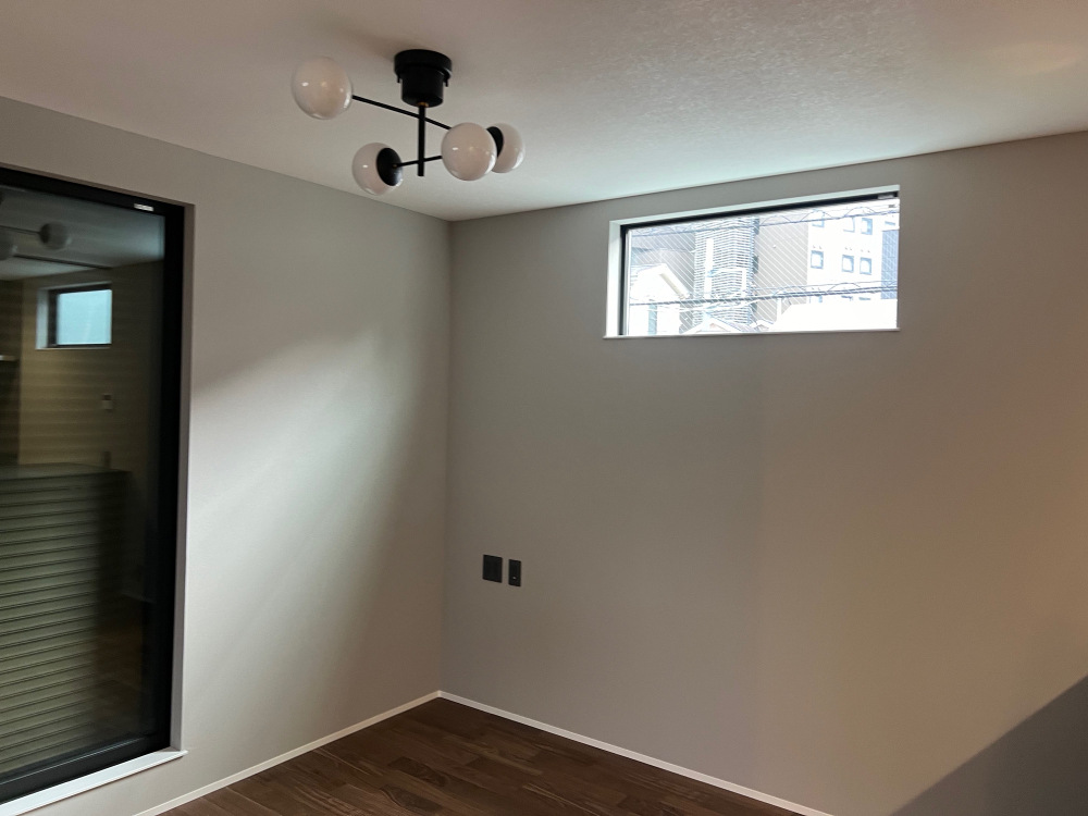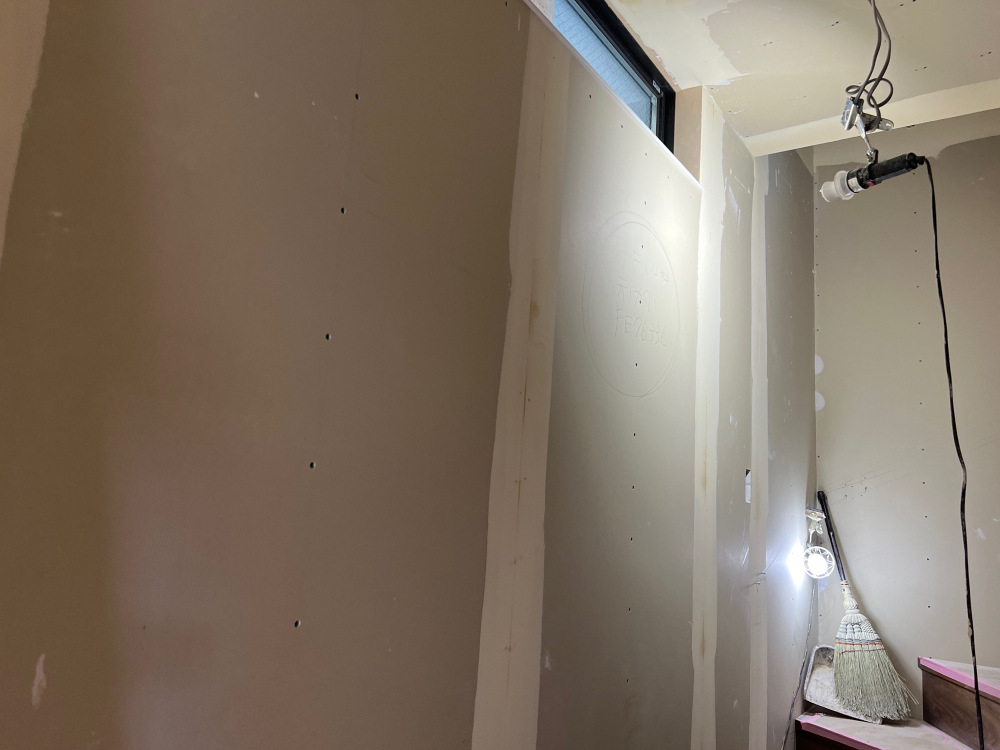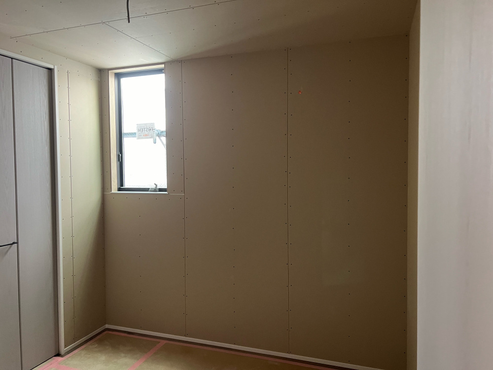 下準備として、石膏ボードのジョイントやビスが打ってある部分の下地処理(パテ)を行っています。