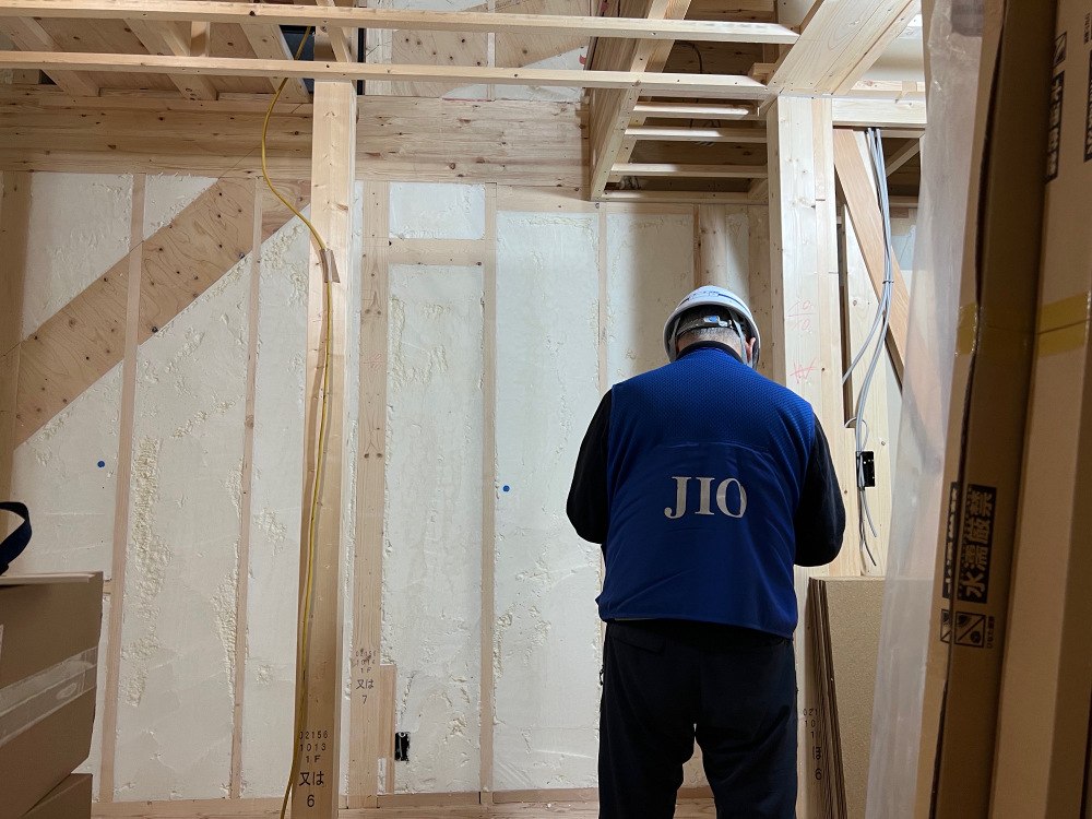先日施工した断熱材が規定の厚みで隙間なく施工されているかチェックしてもらいます。