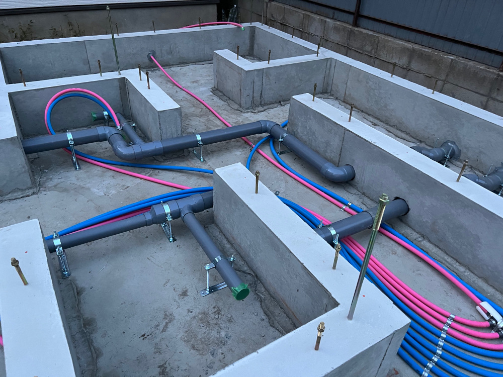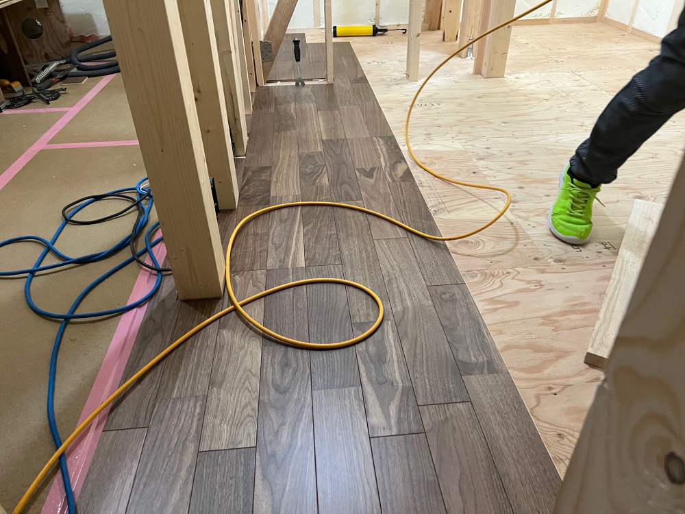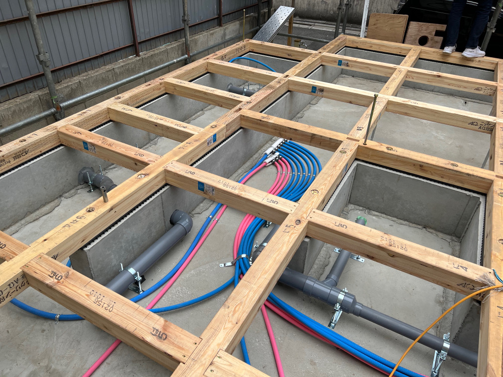 後日床下に潜らなくてもいいように、先行で配管をしておく工程です。