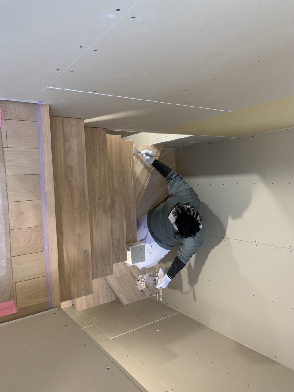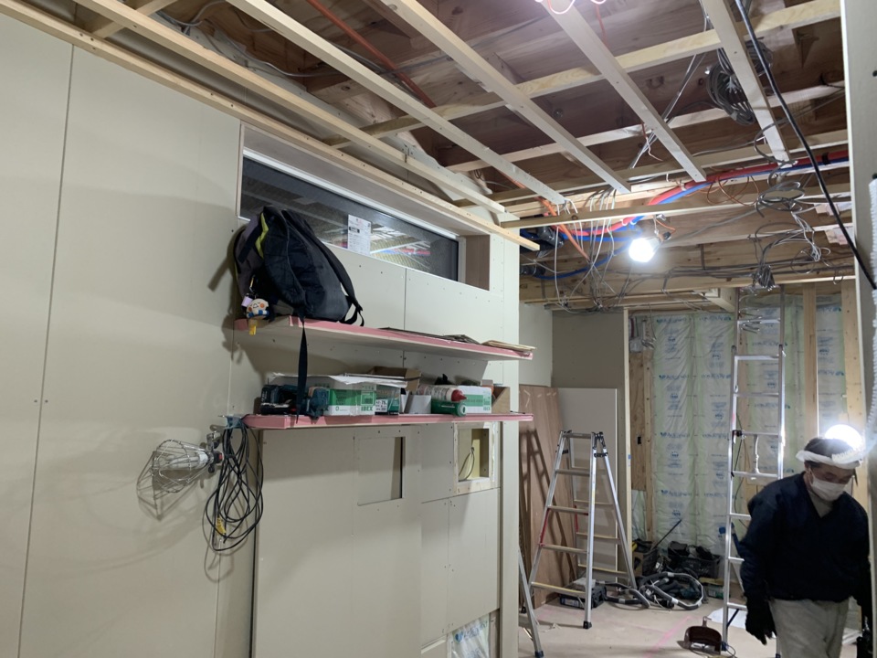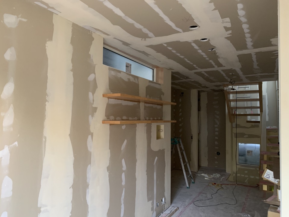 石膏ボードのジョイント・ビスの打ってある部分の下地処理(パテ)を行いクロスを貼っていきます。