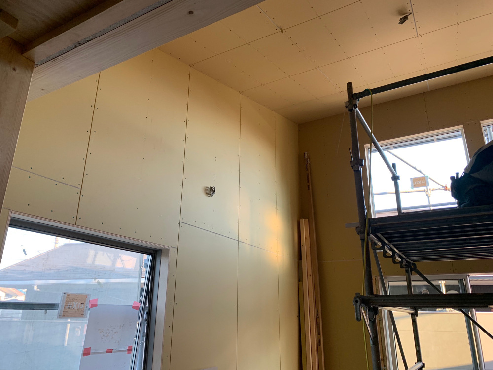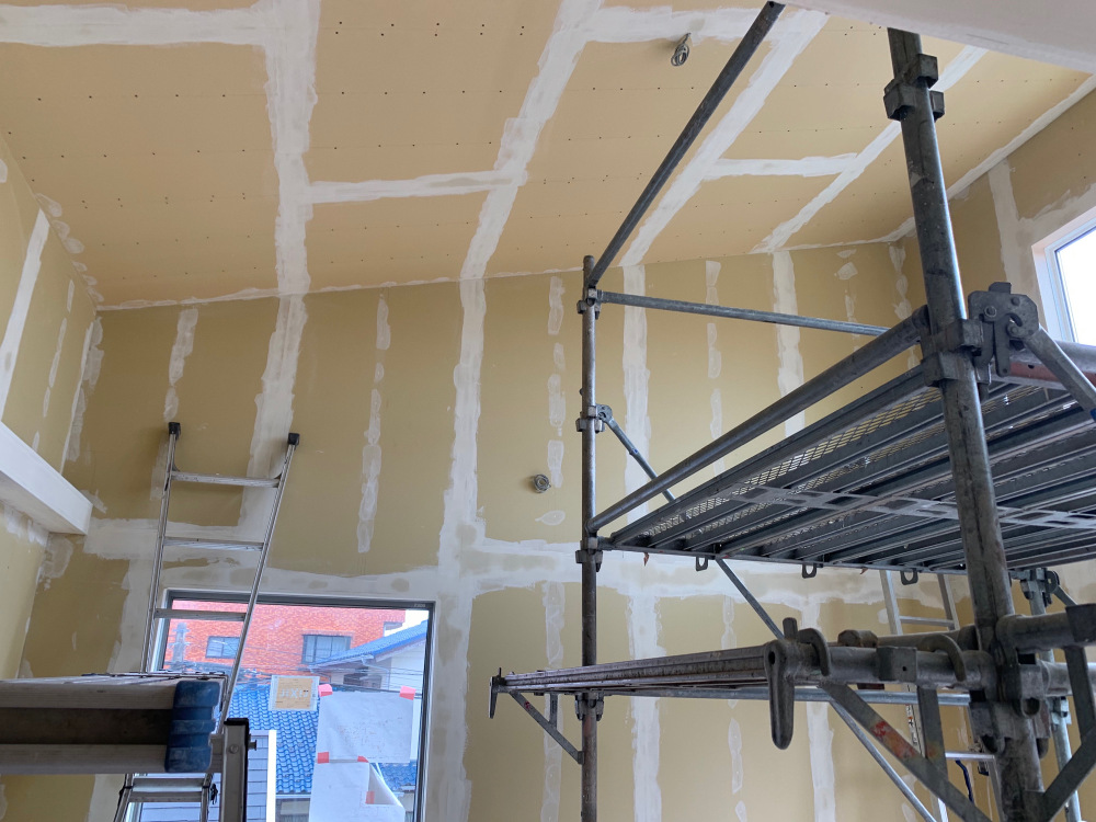 クロスを張る前処理としてボードの継ぎ目やビスのところへパテ処理をし平にする作業を行っています。