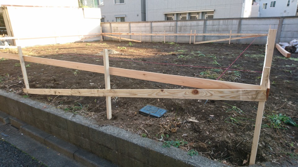 基礎工事に重要な情報が記載された囲い=遣り方を施工しました。