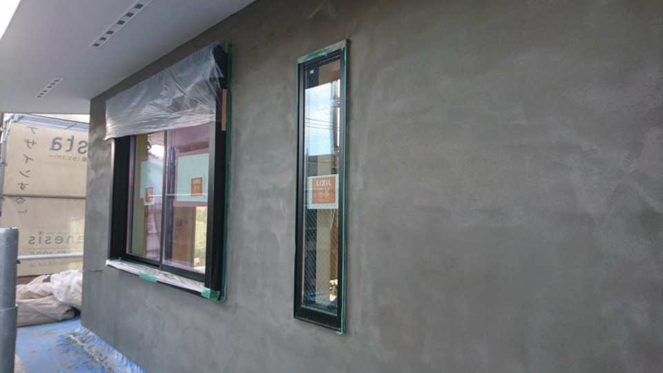今回は目隠し格子が外壁完了後に付きますので、腰壁へ低く作っています。