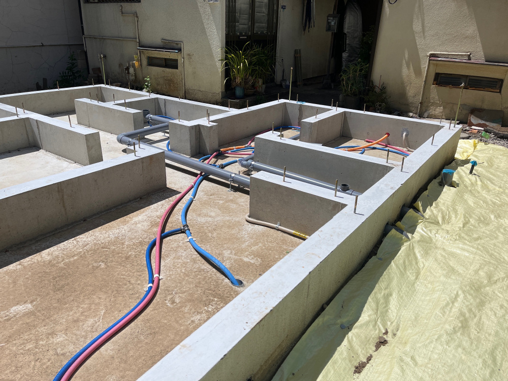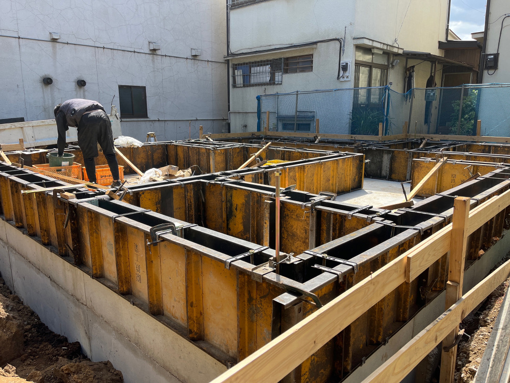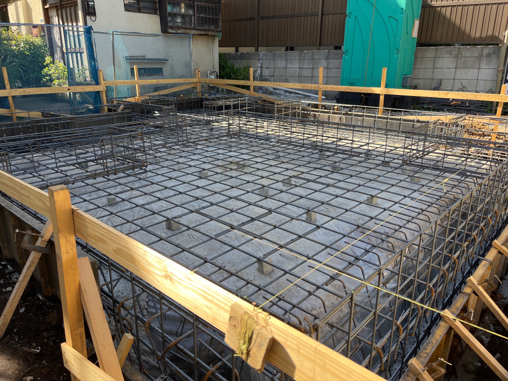 基礎の図面通りに鉄筋を配列させることを配筋といい、全て完了した時点で、自社チェック・第三者機関による配筋検査を受けます。