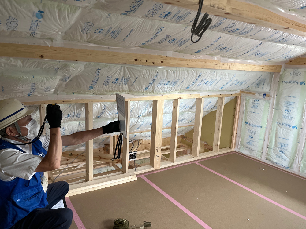 先日施工した断熱材が規定の厚みで隙間なく施工されているかチェックしてもらいます。