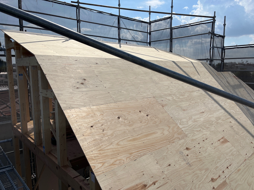 屋根の構造は、下から一般的に野地板→ルーフィング→メイン屋根材の順に仕上がります。