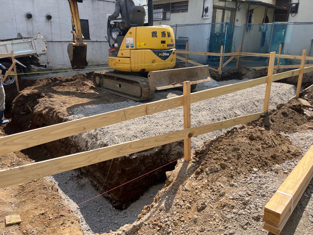 根伐りとは、基礎の形状、高さなどを考慮しで重機で地盤を掘り進める作業です。