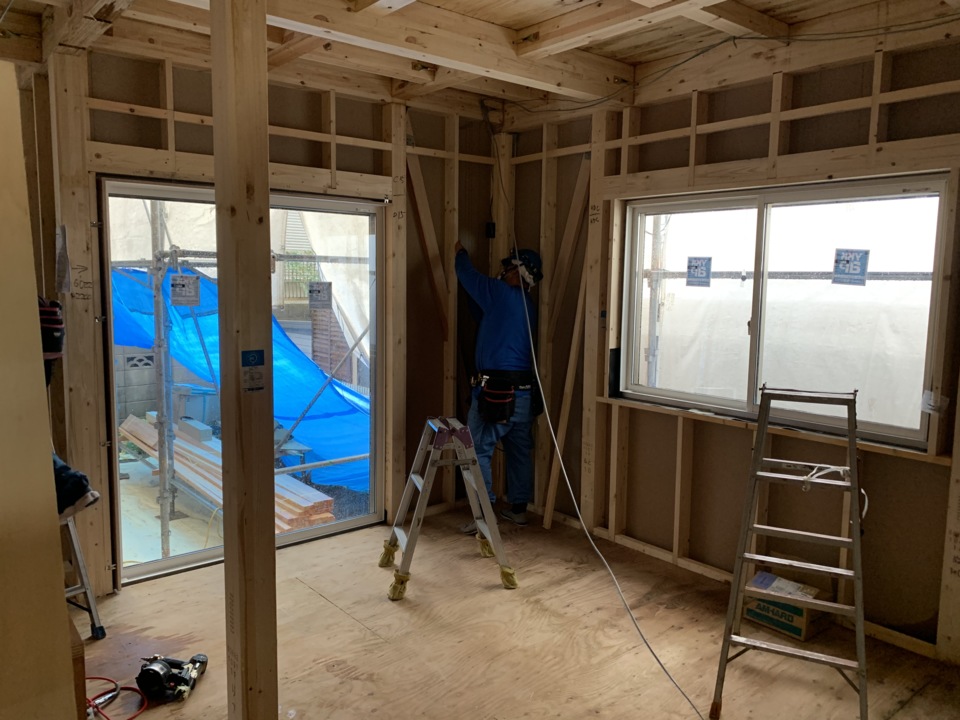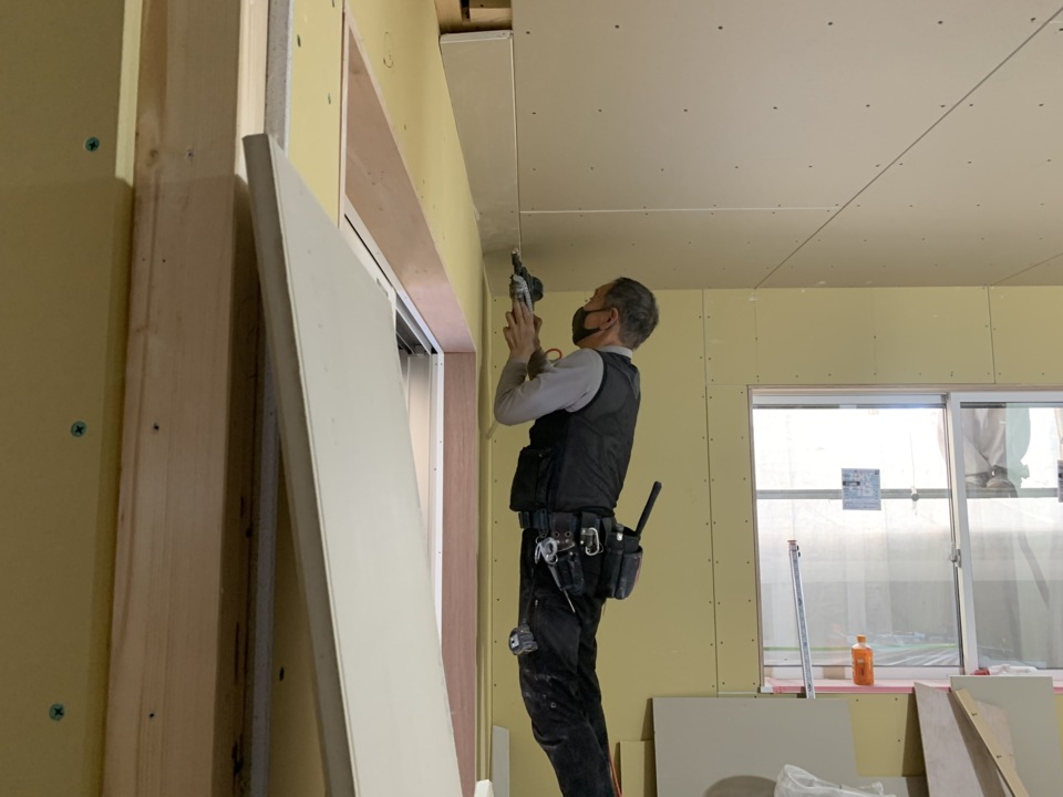 ボード貼り施工中です。