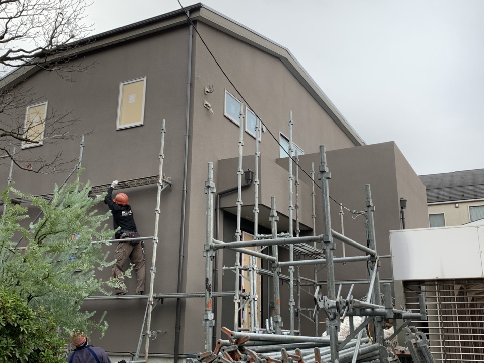 外壁が完了して足場の解体工事をおこなっております。