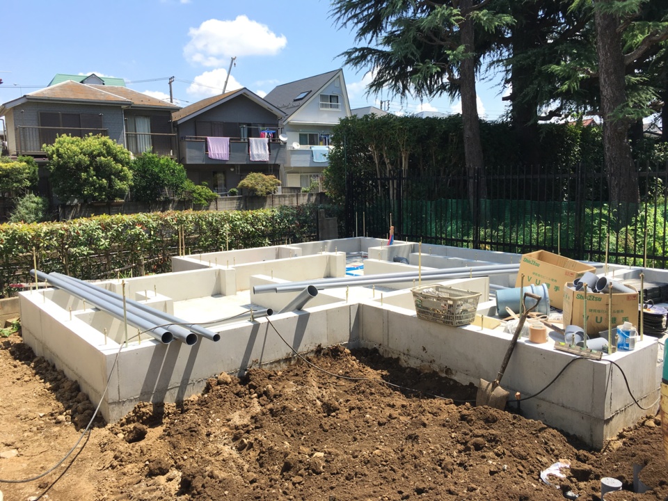 3階建ての為、基礎構造が複雑なうえ深基礎もありましたので、思ったより時間がかかってしまいましたが、基礎業者さんが熱い中頑張ってくれました。