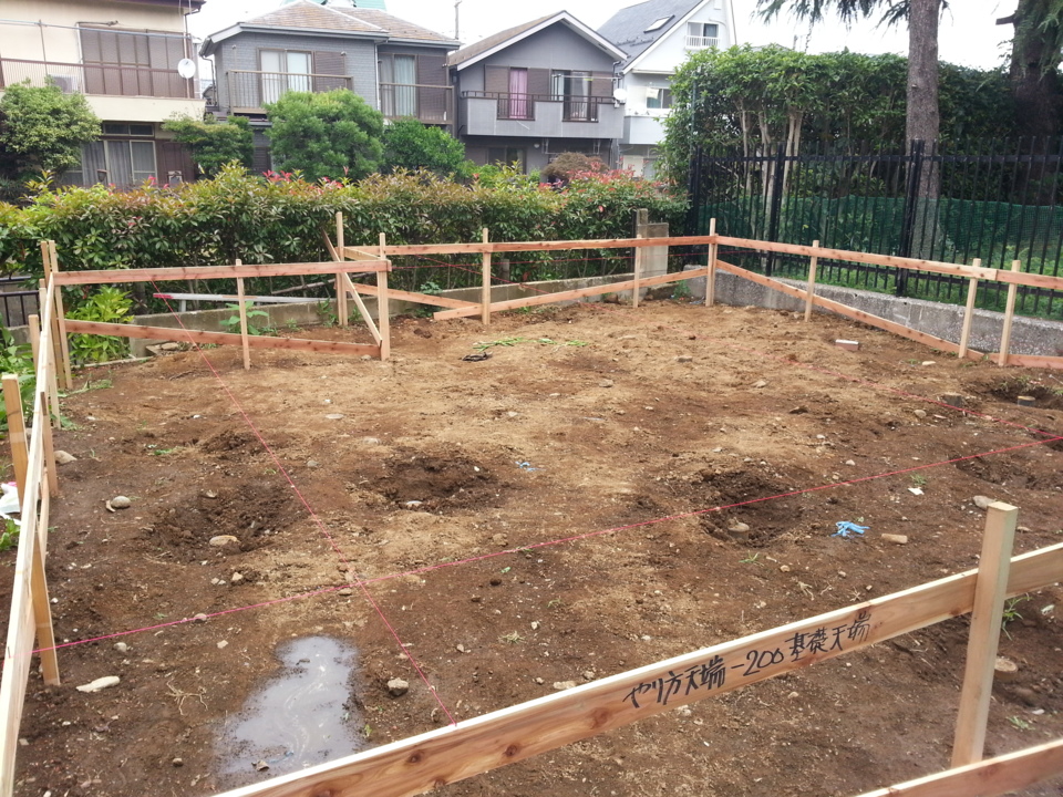 まずは基礎工事となりますが、その工事の目安となる水平・直角・配置などを示した囲いを【遣り方】と言います。