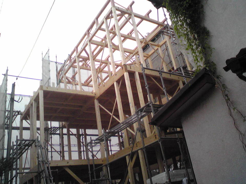 この工事が完了したら先行足場を組み、土台敷きとなります。