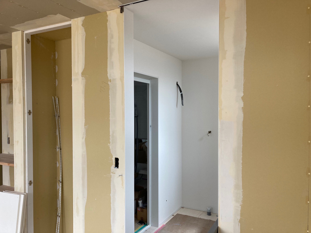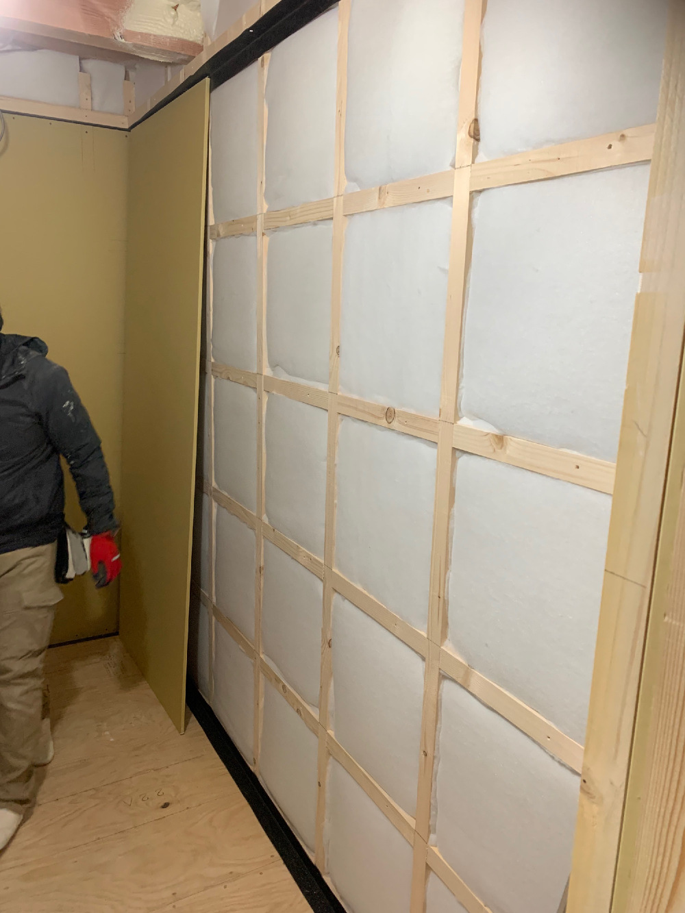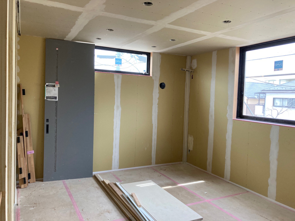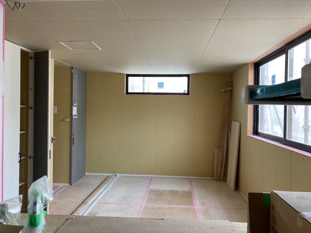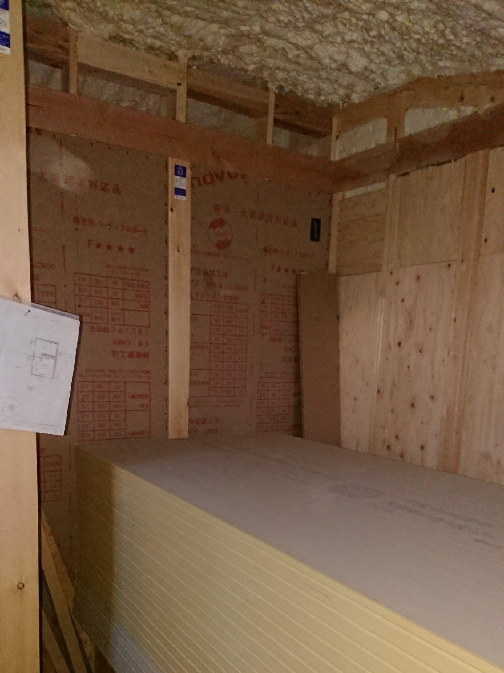 壁の下地が終わったので、石膏ボードの施工が始まります。