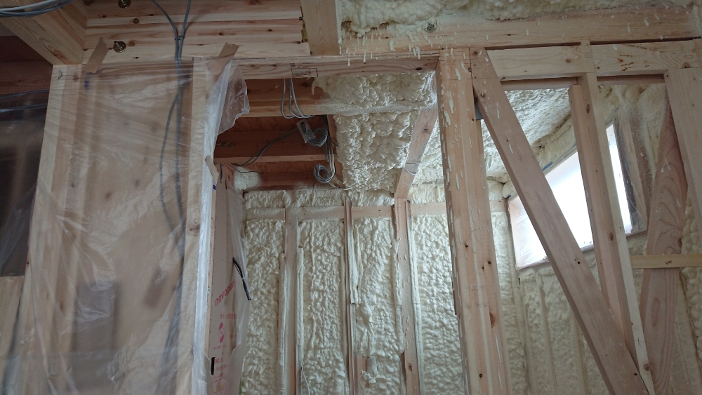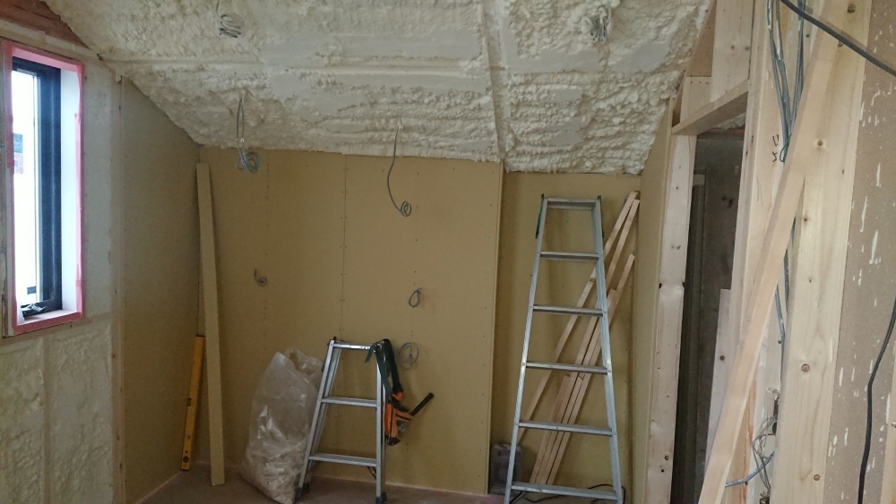 完了後、天井にも断熱材を吹き付けていきます。