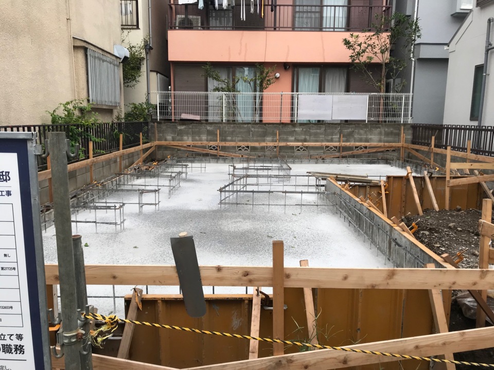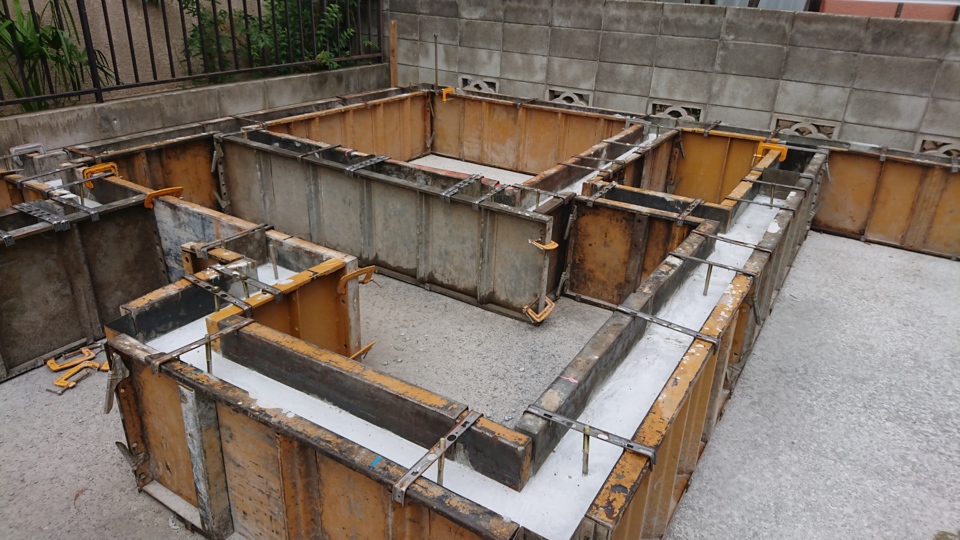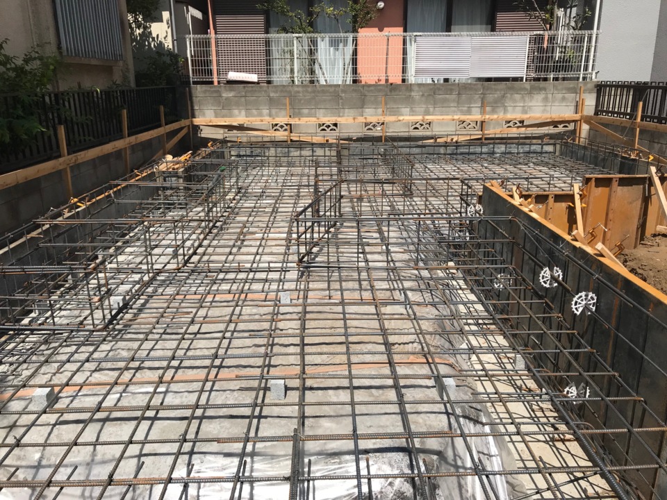 この盤の上に立ち上がり部分の枠を組み、そこに生コンを打設する工程に移行します。
