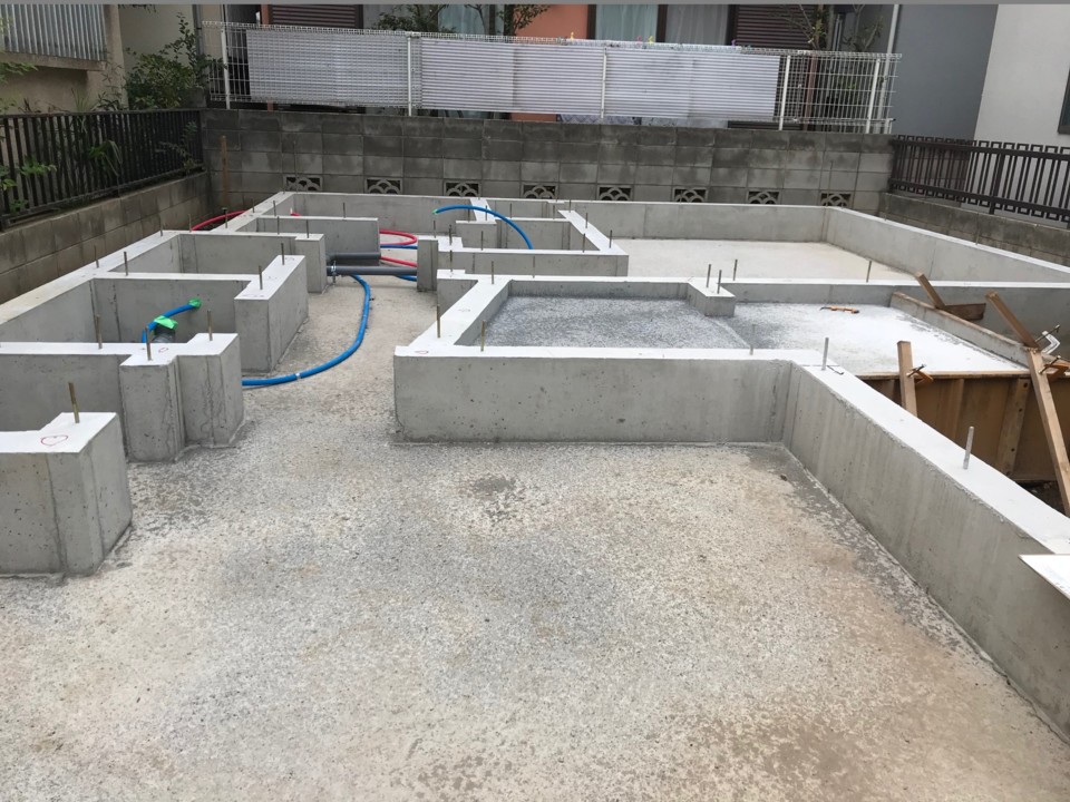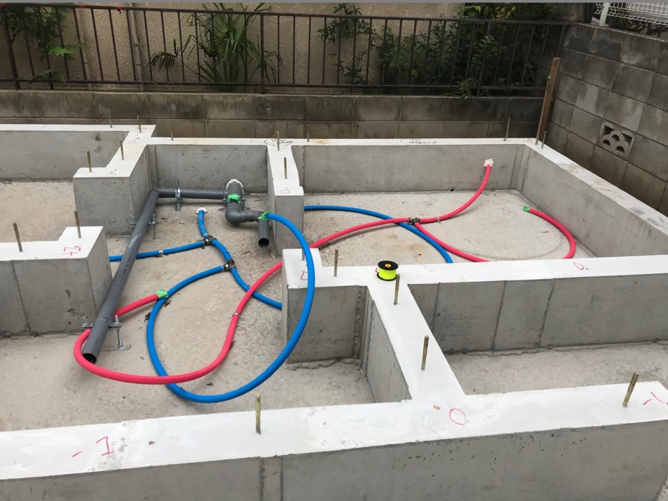基礎工事が完了し、外部、基礎内部の先行配管工事をおこないました。
