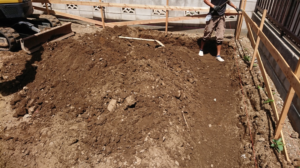 まず初めに建物(基礎)の形状に地面を掘り進めていきます。