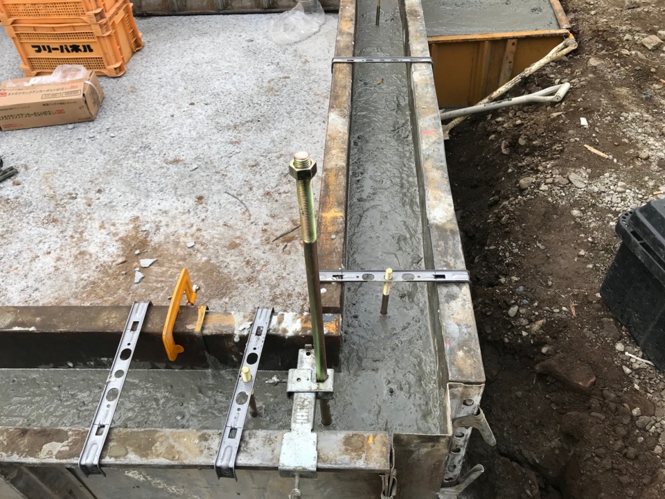 基礎立ち上がりのコンクリート打設後、乾燥を待って天端に柔らかく溶いたコンクリート(レベラー)を流し込み、滑らかな水平を確保します。