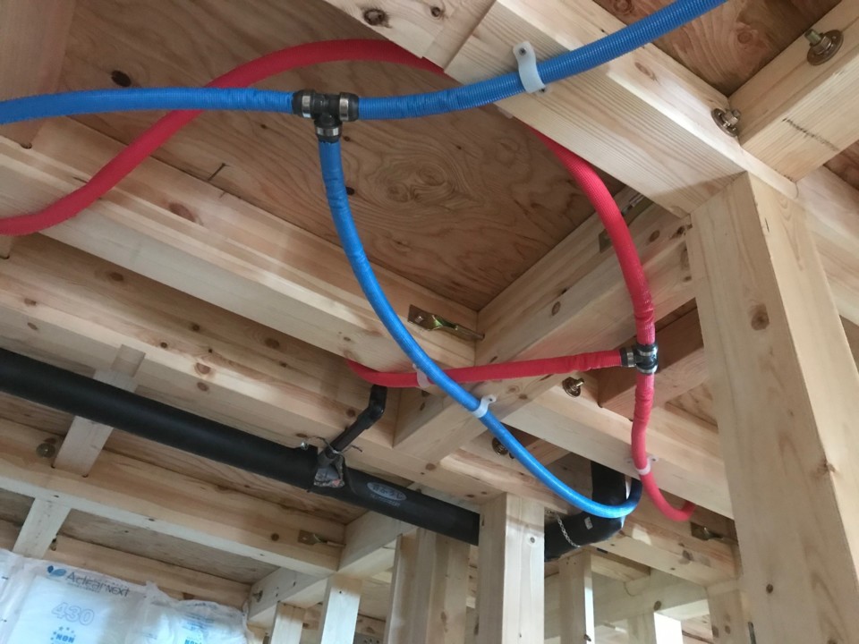 2階にキッチン・トイレがあるので、そこの位置へむかって排水管が梁をつたっています。