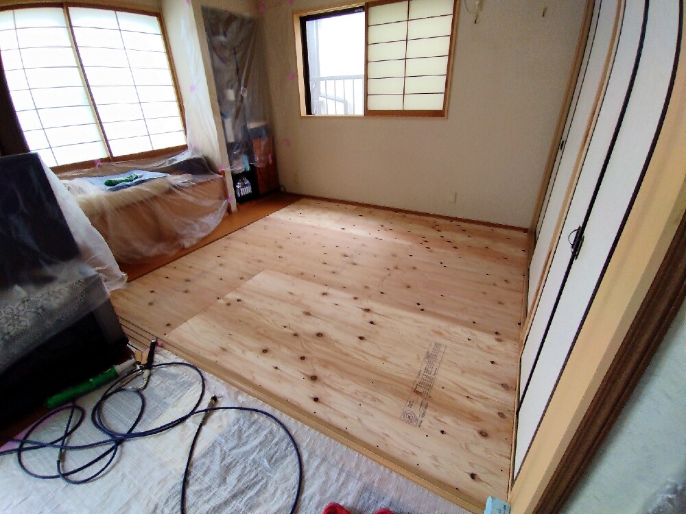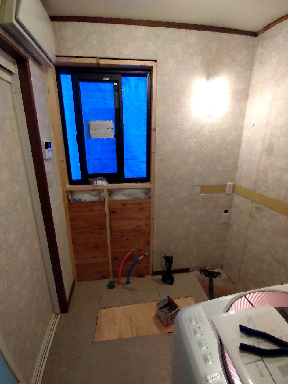窓側に洗面台を取り付けるので、給排水の切り回しも行います。