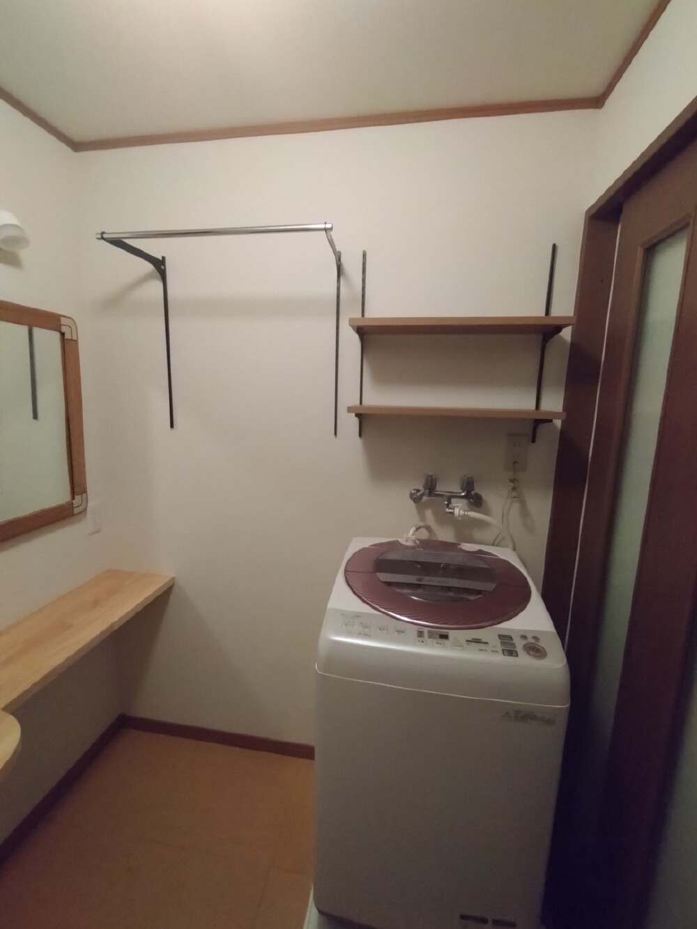 洗面室全体のクロス、クッションフロアを貼り替え、洗濯機上部には可動棚を追加しました。もうすぐ完成になります。