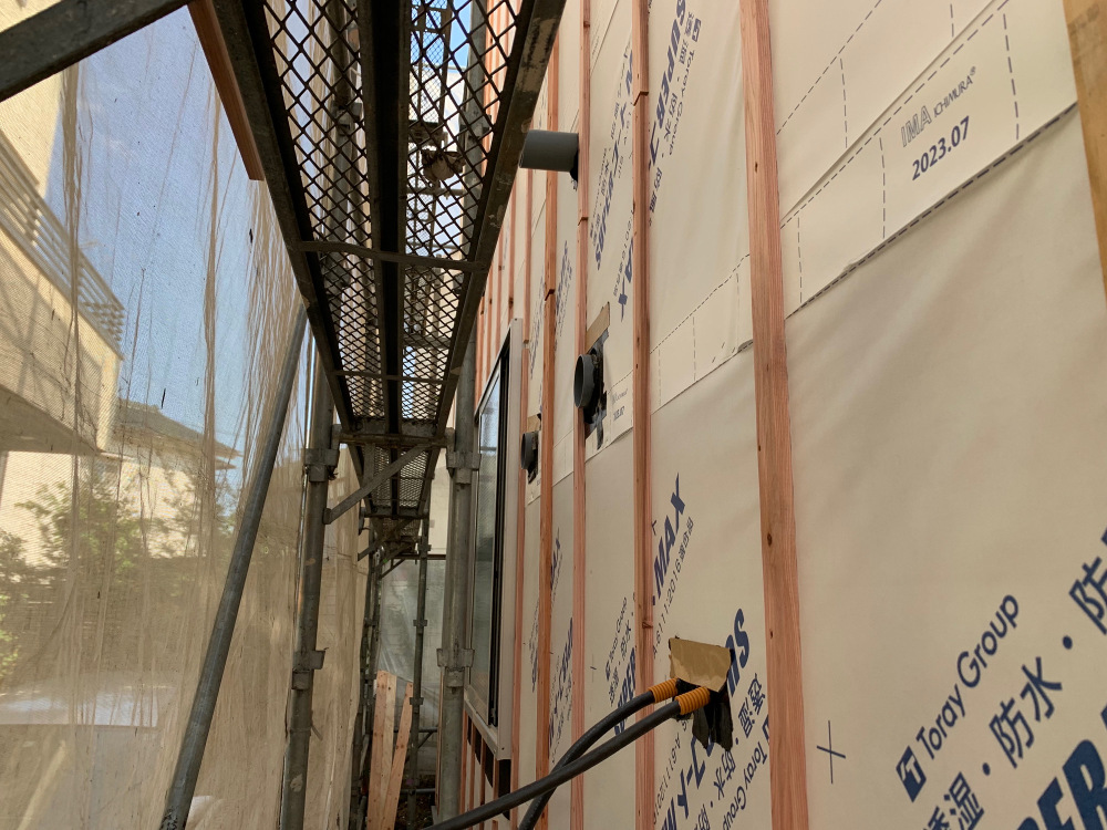 外壁下地に透湿防水シートを施工しました。
