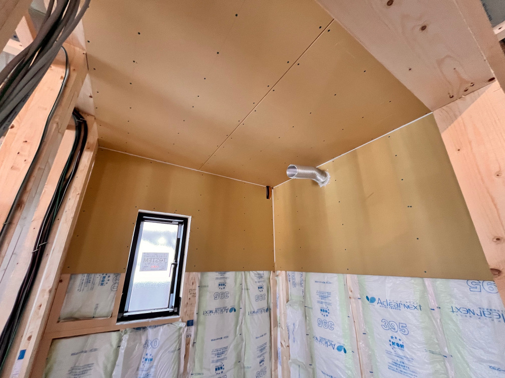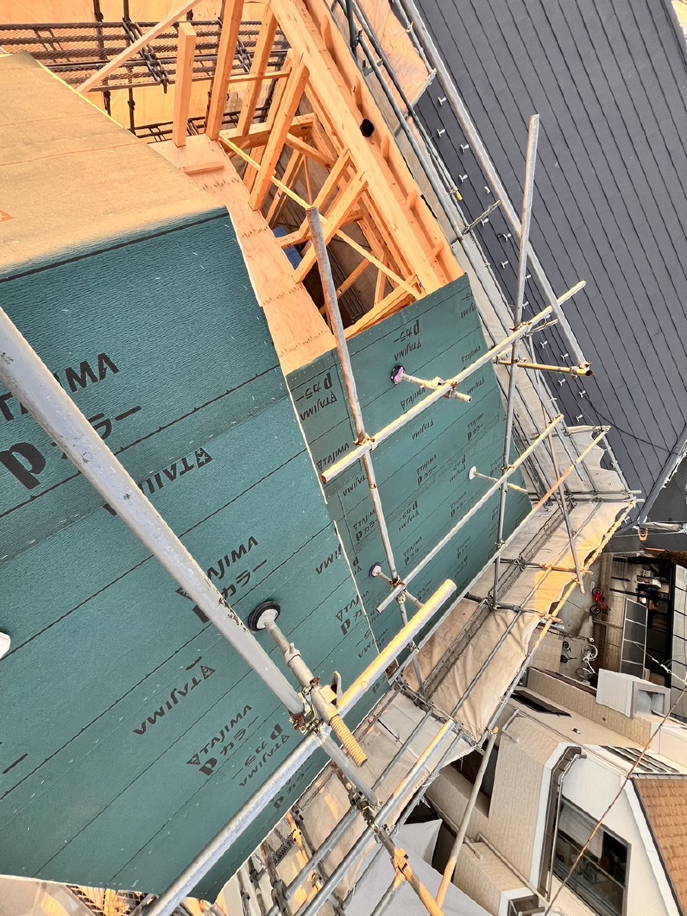 上棟後、大工さんが屋根下地(垂木・野地板)施工しルーフィング敷きを行います。