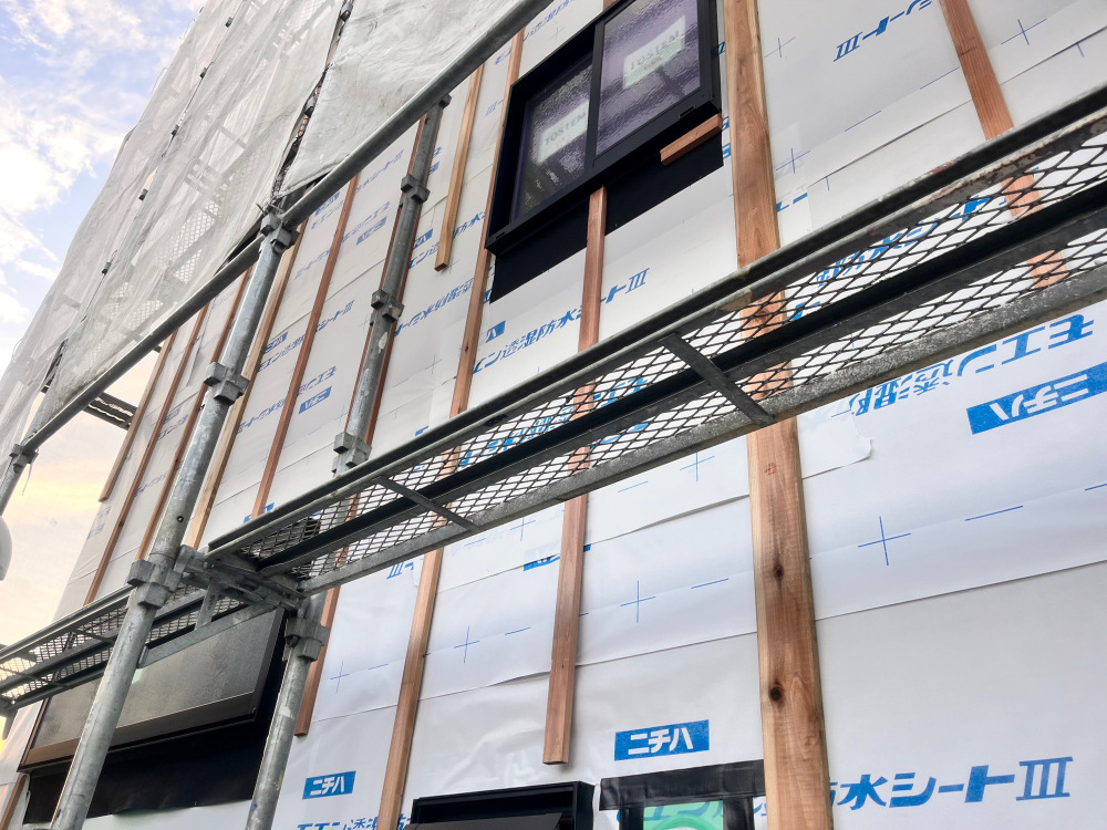 通気胴縁と呼ばれる、外壁の裏に通気層を確保するための板材を取り付けています。
