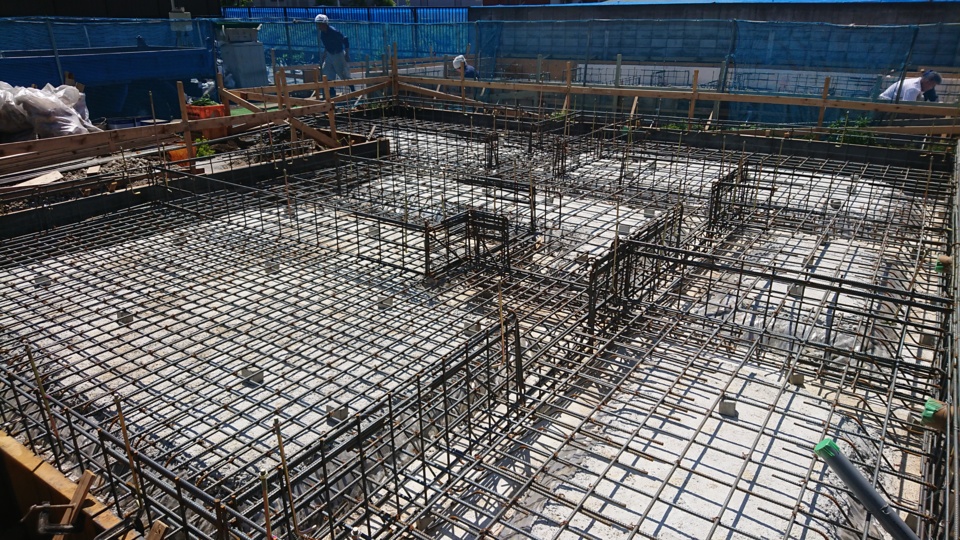複雑な鉄筋の配列ですが、見落とさずに施工しないと、この後におこなう第三者機関による【配筋検査】に不合格となってしまいます。