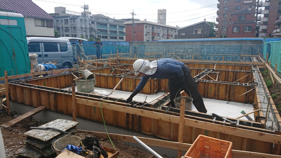 捨コンは強度確保の意味合いもありますが、墨出しや枠パネルを固定するための金具取付等にも必要な工程です。