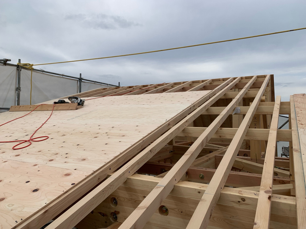 屋根には雨水の進入を防ぐルーフィング材を敷き込みます。