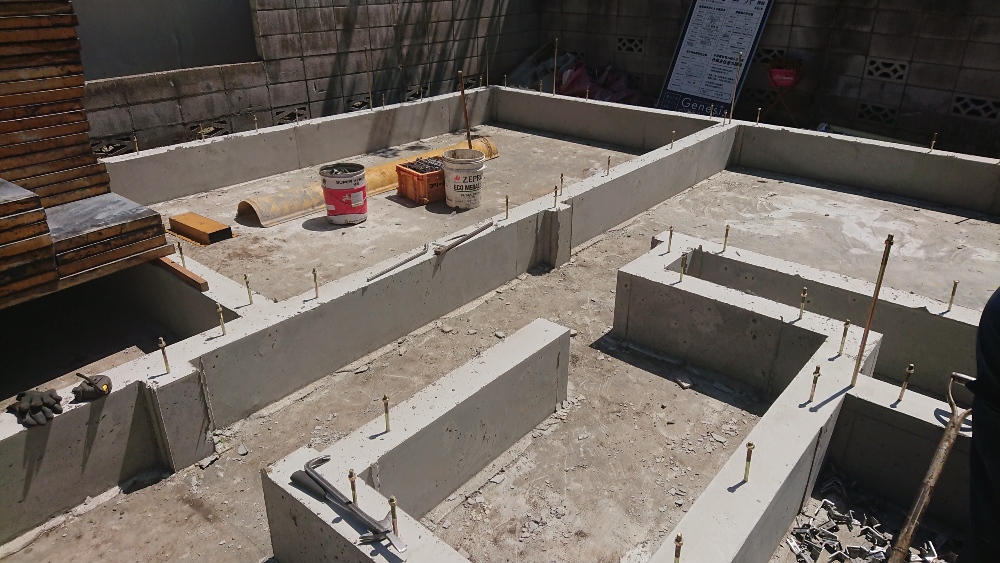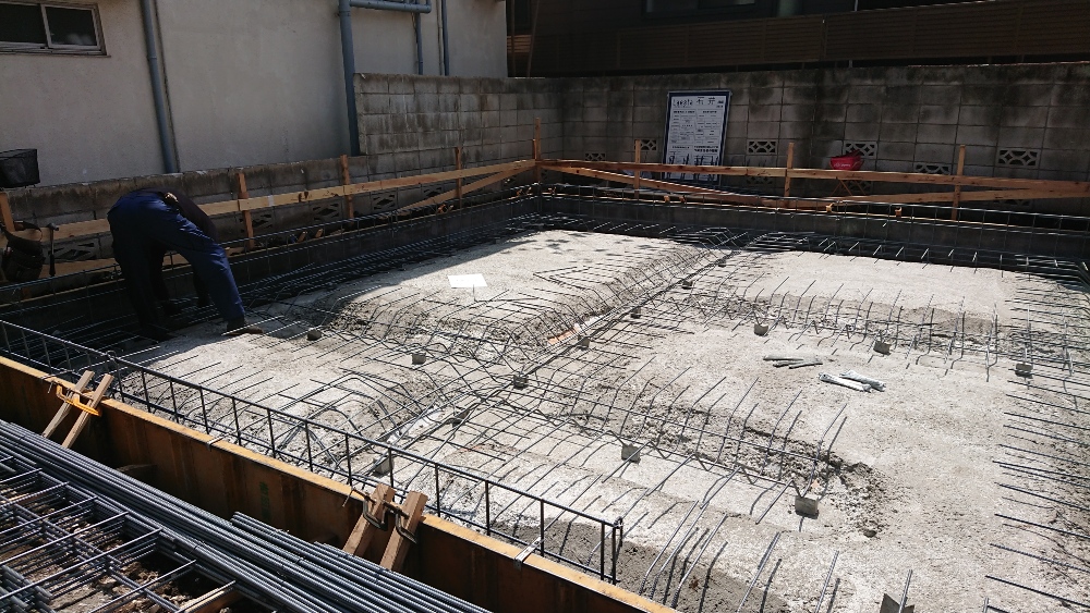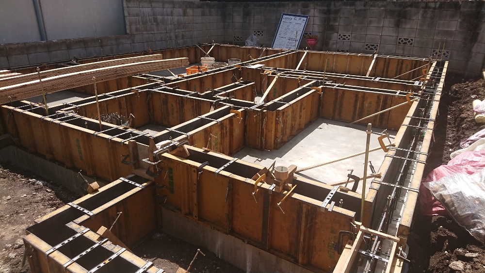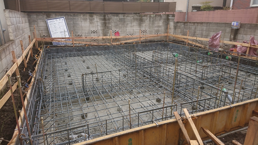 耐圧盤の生コンも乾いてきたら、立上り部分の枠組みをおこないます。